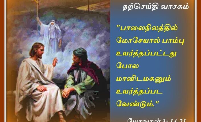இயேசு நிக்கதேமுக்குக் கூறியது: “பாலைநிலத்தில் மோசேயால் பாம்பு உயர்த்தப்பட்டதுபோல மானிடமகனும் உயர்த்தப்பட வேண்டும். அப்போது அவரிடம் நம்பிக்கை கொள்ளும் அனைவரும் நிலைவாழ்வு பெறுவர். தம் ஒரே மகன்மீது நம்பிக்கை கொள்ளும் எவரும் அழியாமல் நிலைவாழ்வு பெறும் பொருட்டு அந்த மகனையே அளிக்கும் அளவுக்குக் கடவுள் உலகின்மேல் அன்புகூர்ந்தார். உலகிற்குத் தண்டனைத் தீர்ப்பளிக்க அல்ல, தம் மகன் வழியாக அதை மீட்கவே கடவுள் அவரை உலகிற்கு அனுப்பினார். அவர்மீது நம்பிக்கை கொள்வோர் தண்டனைத் தீர்ப்புக்கு ஆளாவதில்லை; ஆனால் நம்பிக்கை கொள்ளாதோர் ஏற்கெனவே தீர்ப்புப் பெற்றுவிட்டனர்.